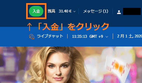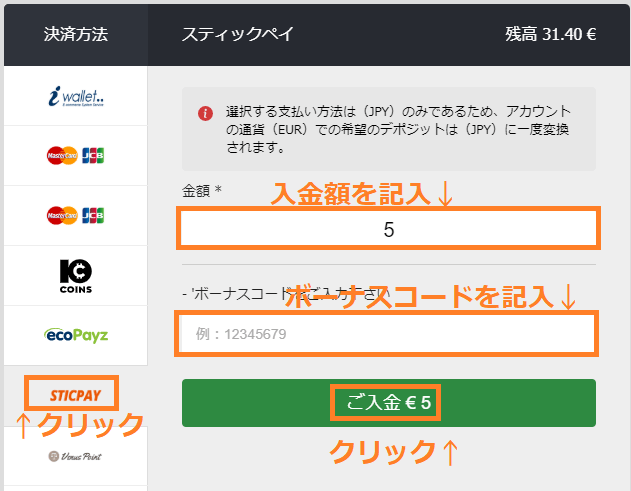 入金方法から「STICPAY」を選択し、入金額(€5以上)を入力します。ボーナスのコードがあれば入力します。そして「入金」をクリックします。