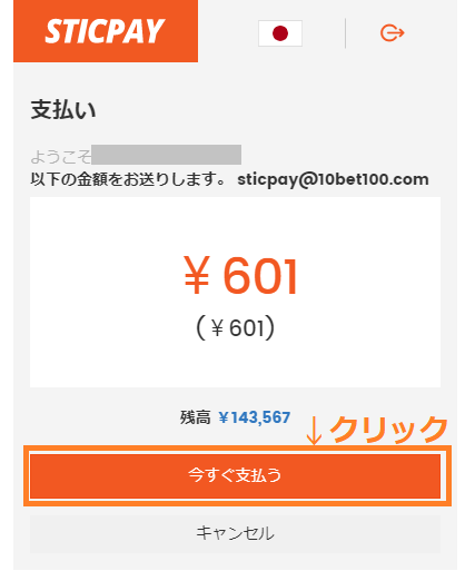 STICPAYのログインフォームが開いたら、ログインしている「今すぐ支払う」ボタンをクリックし、それだけです。以上で入金申請は完了です。