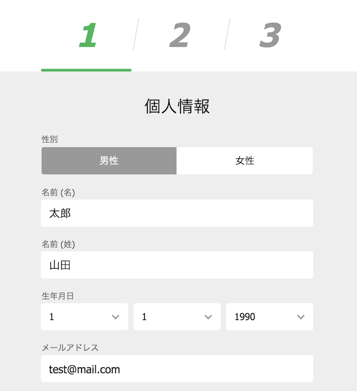 まず、お名前、性別、生年月日、メールアドレスを入力し、「次へ」ボタンをクリックしてください。