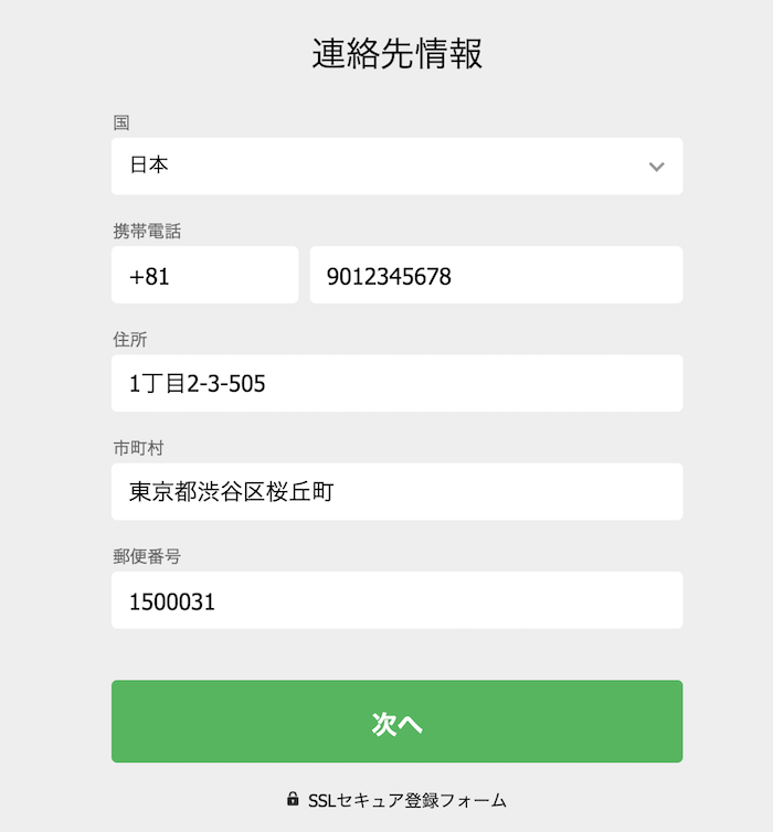 開いたページで、国、電話番号、住所、郵便番号を入力し、「次へ」をクリックします。