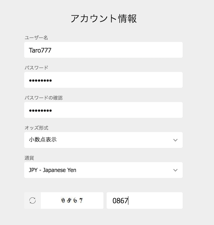 希望ユーザー名、パスワード、オッズの表示形式(小数点のままでOK)、通貨を選び、ランドマの数字を入力してください。