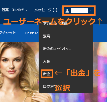 画面右上のユーザー名をクリックし、開いたメニューから「出金」を選択します。