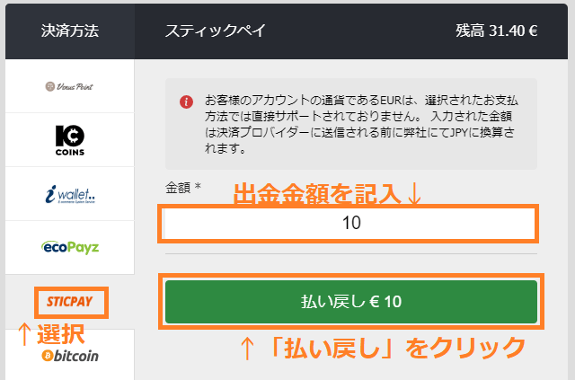 STICPAYの決済システムを選択し、引き落とし金額(€10以上)を入力します。