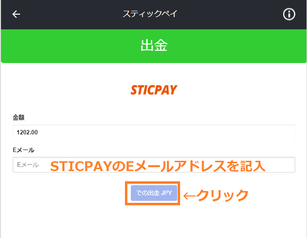 STICPAYのメールアドレスを入力します。そのメールの中の「での出金JPY」をクリックします。以上で出金依頼が完了します。