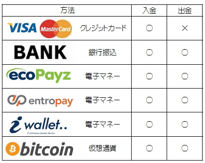 - VISA・MASTER・JCBのクレジットカード、ecoPayz、iWallet、Venus point、ビットコイン、イーサリアム、リップル、ライトコイン。