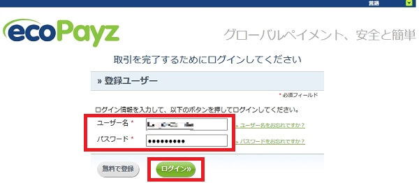 その後で、ecoPayz(エコペイズ)サイトのログインしないと、ユーザー名とパスワードを入力して、ログインします。