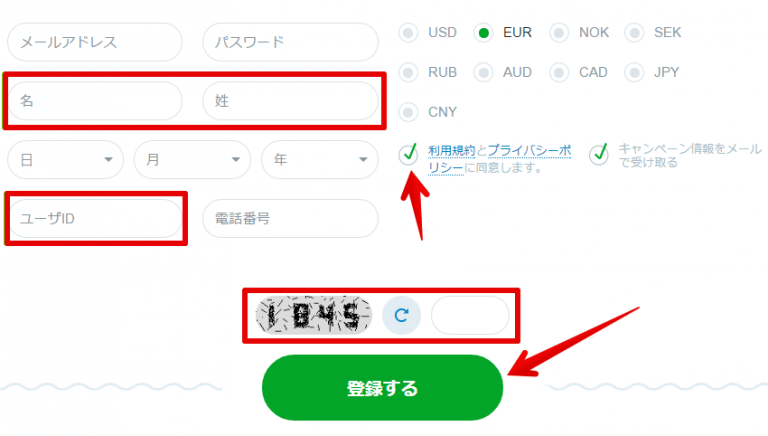 この登録のページで要る情報を入力してください。これは、お名前、メールアドレス、パスワード、生年月日、ユーザーID、電話番号、通貨です。