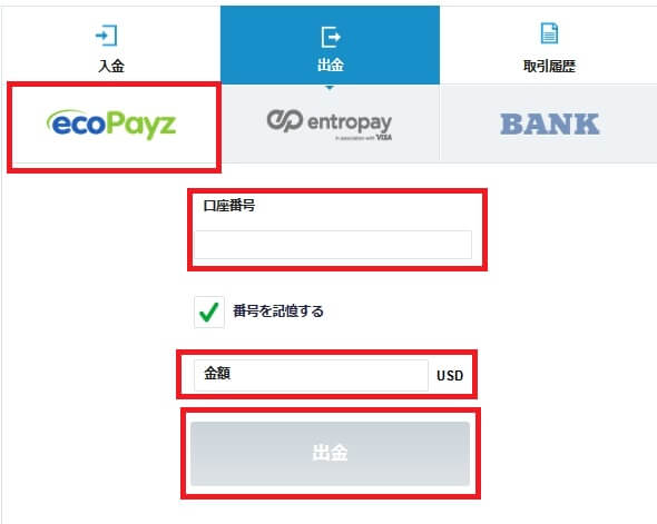 出金方法の中からエコペイズを選択し、口座番号、金額を入力して「出金」ボタンをクリックします。