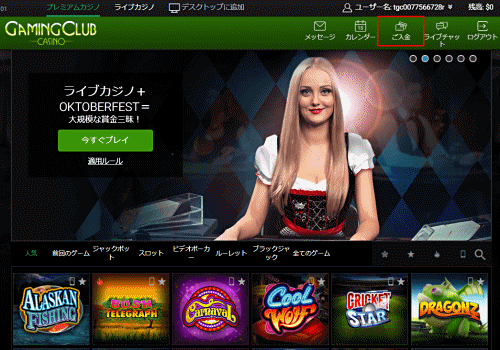 ゲーミングクラブカジノログインして、ホームページで「ご入金」をクリックします。