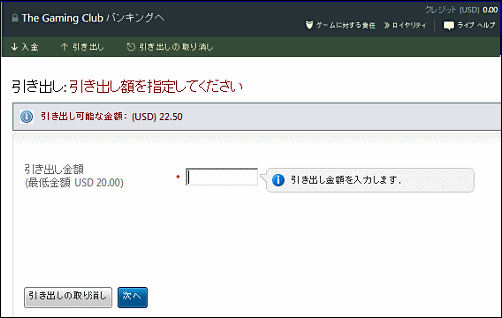 入金方法の同じです。まず、ゲーミングクラブカジノのホームページでバンキングにアクセスします。「ご入金」を押しても表示されます。