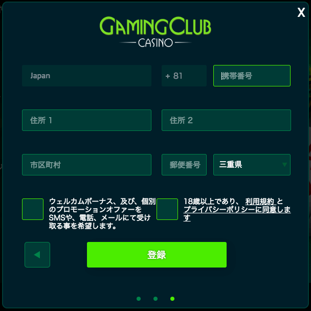 最後に、携帯電話番号、住所を入力してください。「カジノからのメールを受け取るか?」と「利用規約」にチェックを入れて「登録」をクリックしてください。