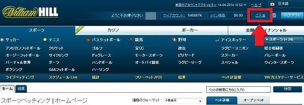 まず、ウィリアムヒルカジノのホームページを開いてください。トップページの上部からログインした後、「ご入金」ボタンをクリックしてください。