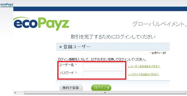 ここで、エコペイズのユーザー名とパスワードを入力してください。