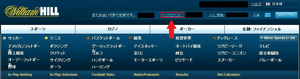 出金するために、ウィリアムヒルカジノでトップページの「マイアカウント」をクリックします。