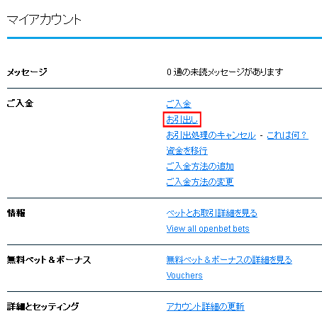 次にアカウントページの「お引き出し」ボタンをクリックします。