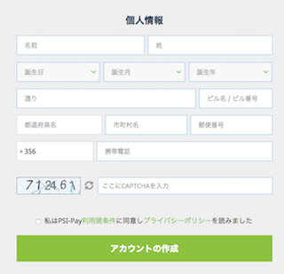 個人情報の入力、数字の認証(CAPTCHA)、利用規約への同意が全て終わったら「アカウントの作成」ボタンをクリックし、登録が完了となります。