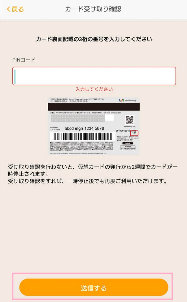 次に、裏面の暗証番号を登録します。スマホアプリを開き、暗証番号を入力して「送信」ボタンをクリックします。