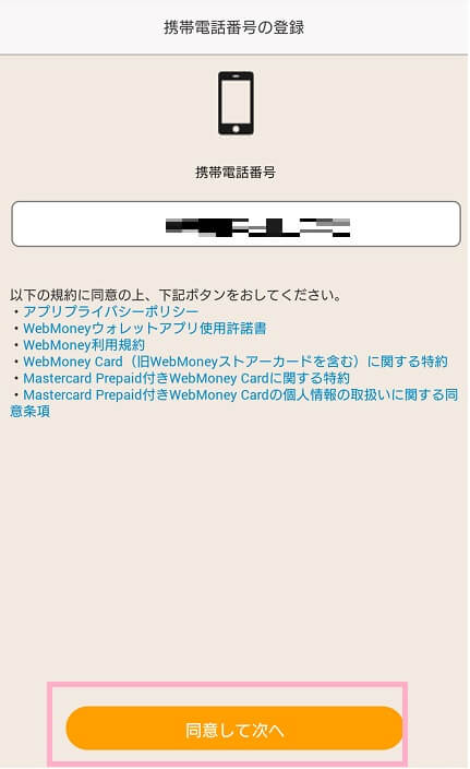 ダウンロードしてインストールしたら、アプリを開き、携帯電話番号を入力して「同意して次へ」ボタンを選択します。